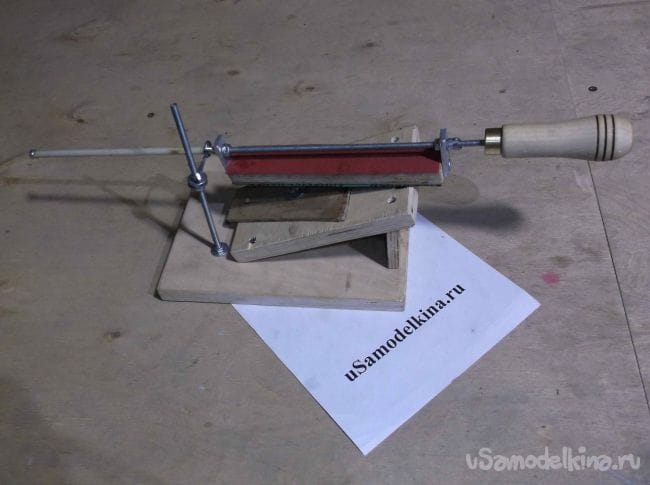 Всем здравствуйте! Предлагаю свой вариант самодельного приспособления для правки ножей. Как видно из названия и фото, состоит данное устройство в основном из фанеры и еще нескольких легкодоступных деталей. Сборка данной самоделки не займет много времени и под силу любому. Некоторые скажут, зачем собирать, когда в магазине полно готовых и недорогих решений. Отвечу так, одно дело купить и совсем другое собрать своими руками, тем более, если вы читаете данную статью, значит вы в гостях у Самоделкина, а здесь люди делятся своими самоделками. Не думайте, что данное приспособление нужно только тем, кто занимается ножами, лично я поправил с помощью данной «приспособы» несколько кухонных ножей – результатом доволен!