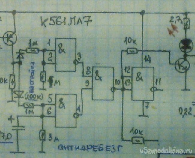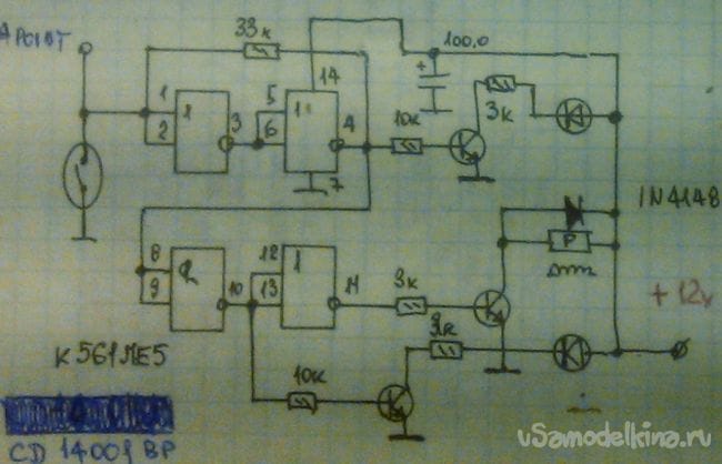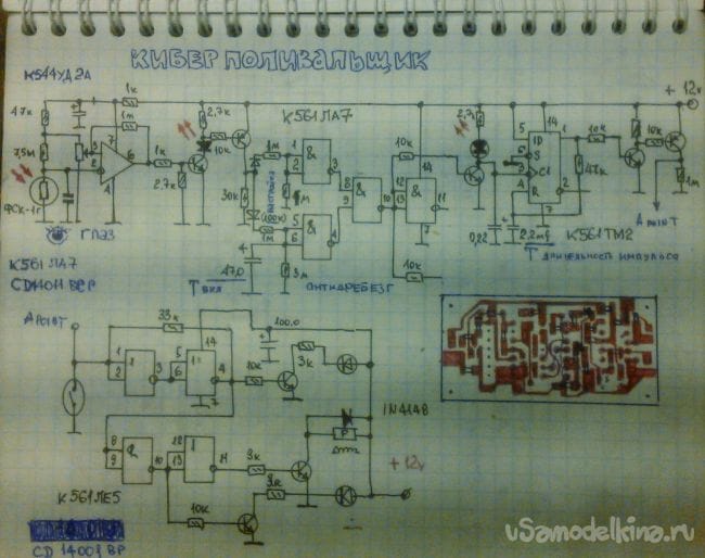 - антидребезг. (предотвращение ложных срабатываний устройства при форсмажорной засветке фото-датчика то есть, вспышки молний, фар проезжающих автомобилей в тёмное время суток. Они могут нарушить цикл работы «день-ночь») Да-а-а, кстати, если резистор 10к базы транзистора подключить к выводу микросхемы «11», то процесс орошения будет стартовать не вечером, а на рассвете. Можно усовершенствовать схему дополнив ещё одним трактом – антидребезг+ таймер импульса+ управление, сняв команду с «11» вывода для второго тракта. Получится, что часть растений будет орошаться вечером, часть утром.
