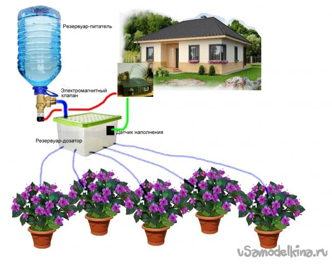 С наступлением темноты электроника поливальщика запитывает реле, которое, в свою очередь, управляет либо электромагнитным клапаном, либо водяным насосом. Клапан используется в случае использования резервуара-накопителя, в котором содержится определённое количество воды (например, запас на неделю-две). Соответственно, емкость для этих целей может быть любых размеров. Из резервуара-накопителя вода через клапан или от насоса поступает в резервуар-дозатор. Название говорит само за себя. Суть полить растения, а не залить. Так как капилляры от дозатора до растения горрраздо тоньше шланга питателя уровень в дозаторе через некоторое время поднимется до точки, где установлен датчик наполнения в виде геркона, помещённого в пластиковую герметично закупоренную с одной стороны пластиковую трубку, установленную вертикально. Поплавок с небольшим кольцевым магнитом, свободно ходящий вверх-вниз по трубке взаимодействуя с герконом, создаст контакт и команда на отключение клапана или насоса поступит в поливальщик (датчик наполнения может быть и другой конструкции). Реле обесточится. Схема питания исполнительных устройств «рассыплется» до следующего вечера.