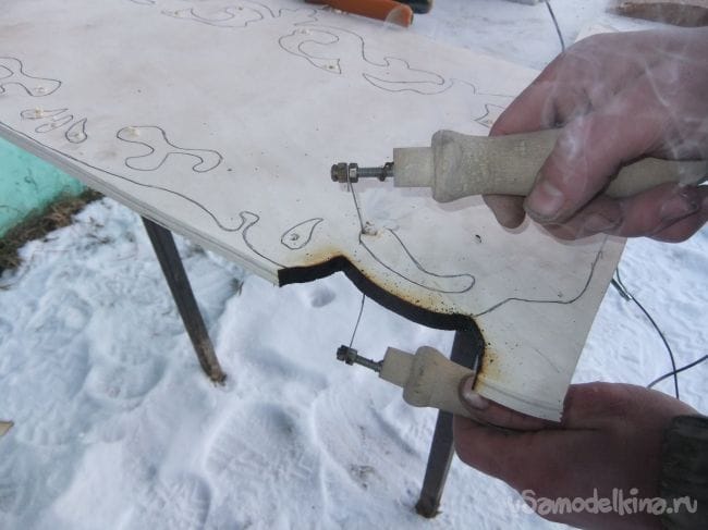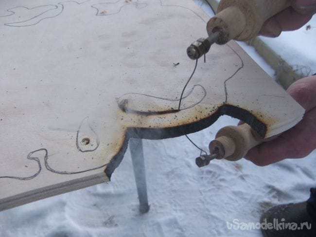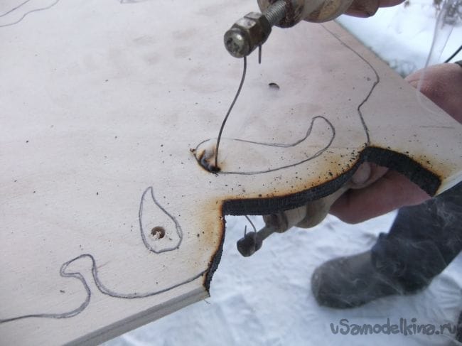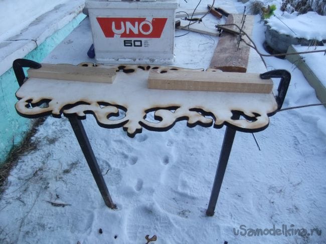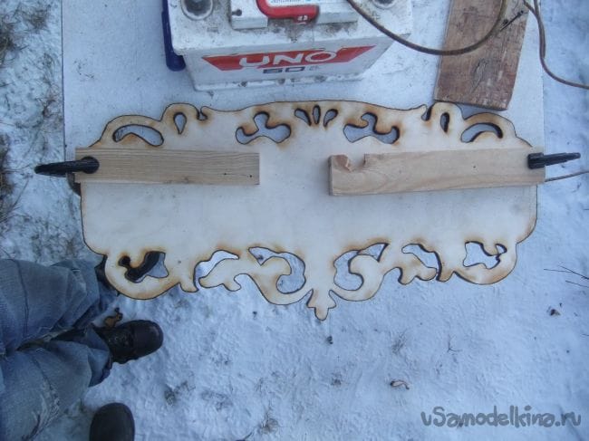 Затем эту доску с надписью приклеил на клей ПВА к основной доске с узором и с другой стороны закрепил шурупами также для надёжности держания.