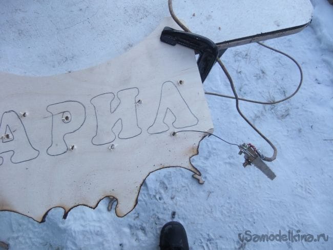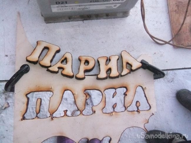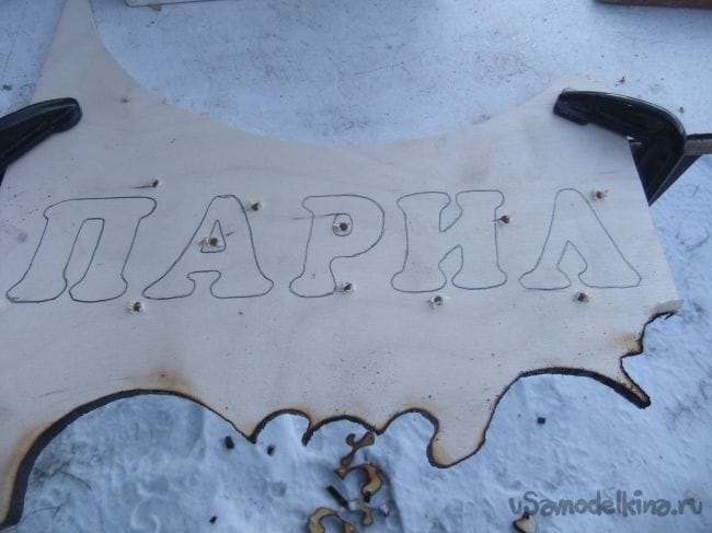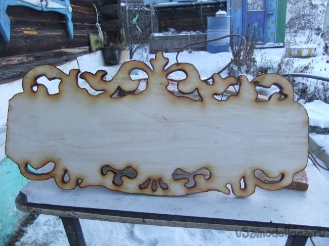 Вырезал из фанеры доску размерами (58 см на 11 см) и затем отшлифовал. Приклеил к ней буквы на клей ПВА и закрепил с другой стороны шурупами для надёжности.