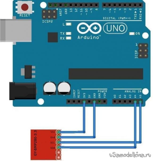 Второй этап. Проверяем плату GY-BMP280-3.3 для измерения барометрического давления и температуры. Берем 4 проводка, соединяем ими GY-BMP280-3.3 и Arduino Uno, как изображено на фотографии и схеме. Кривые тонкие разноцветные линии – это проводники.