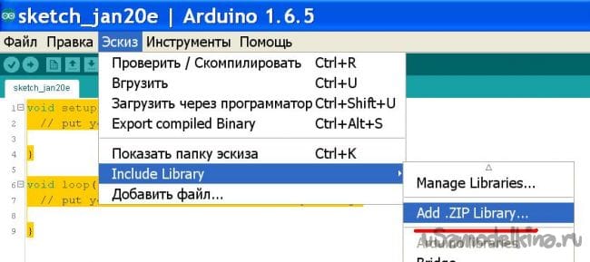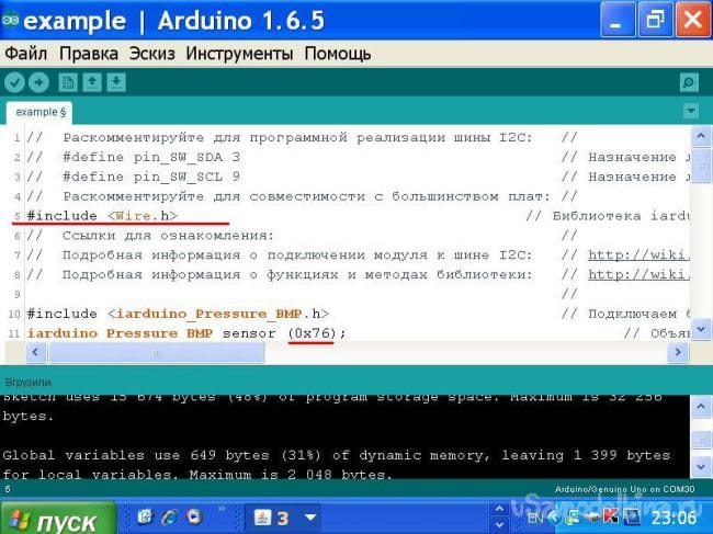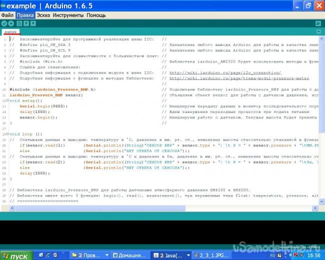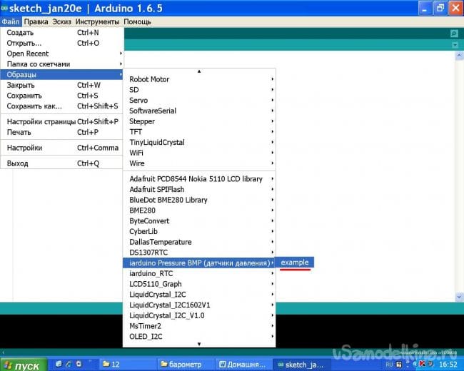 Запускаем Arduino IDE, заходим в меню Эскиз/Include Librari/Add.ZIP Library… далее выбираем файл iarduino_Pressure_BMP.zip и нажимаем кнопку Open. Так же надо установить библиотеки: iarduino.ru/file/198.html, iarduino.ru/file/49.html . После установки библиотек перегружаем оболочку Arduino IDE, то есть закрываем её и запускаем заново. Затем выбираем в меню Файл/Образцы/iarduino Pressure BMP (датчики давления)/example.