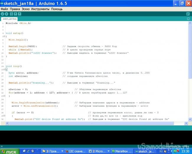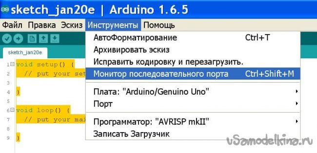 Я запустил оболочку Arduino IDE, из статьи скопировал программный код и вставил его окно Arduino IDE.