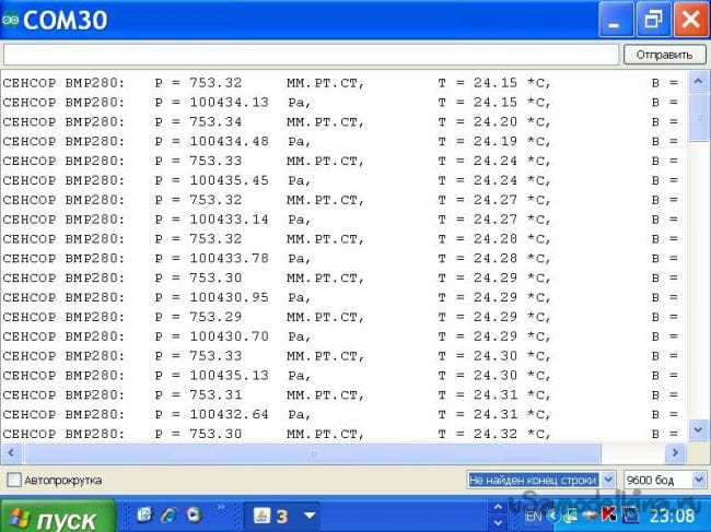Если загрузка пройдет удачно, то, открыв монитор последовательного порта в меню: Инструменты/ Монитор последовательного порта, мы увидим данные, отправляемые платой GY-BMP280-3.3.