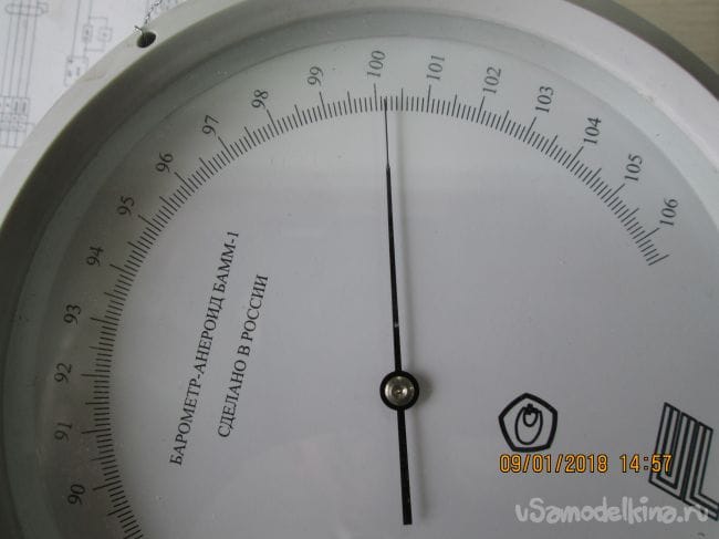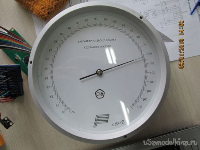 В это же время был сфотографирован лабораторный барометр-анероид, который находился рядом с платой GY-BMP280-3.3. Сравнив показания приборов, вы сами можете сделать выводы о точности работы платы GY-BMP280-3.3. Барометр-анероид аттестован государственной лабораторией.