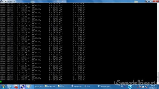 На следующем снимке экрана результат работы платы GY-BMP280-3.3 на компьютере, на котором не установлена оболочка Arduino IDE. Данные получает программа PuTTY.
