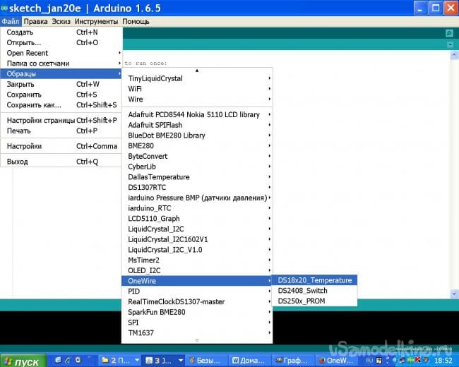 Открываем образец DS18x20_Temperature, компилируем, загружаем, смотрим результат измерения в мониторе последовательного порта. Если все работает, приступаем к следующему этапу.