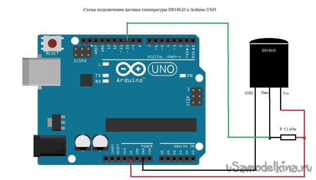 Четвертый этап. Проверка датчика температуры DS18b20. Подключаем его по следующей схеме.
