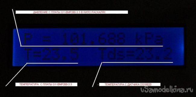 Плата GY-BMP280-3.3 выдаёт давление в паскалях, что не очень удобно. Решить задачу, как заставить плату GY-BMP280-3.3 выдавать данные по давлению в килопаскалях, я не смог. Я решил эту задачу в строке вывода на дисплей LDC.