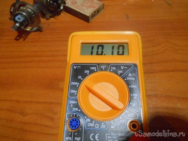 Если напряжение увеличили, то ток должен упасть… Проверяем подключением автолампочки