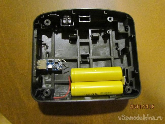 В корпус установил две литиевые батарейки, вынес выключатель наружу и добавил блок зарядки телефона.