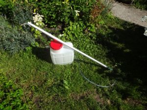 Как изготовить (см. фото). Малогабаритный погружной насос устанавливается внутри бака . Работает тихо. Напор хороший. Если деревья высокие, штанга 2-3 м. При этом нрапор практически не меняется. Аккумулятор ношу в кармане куртки.