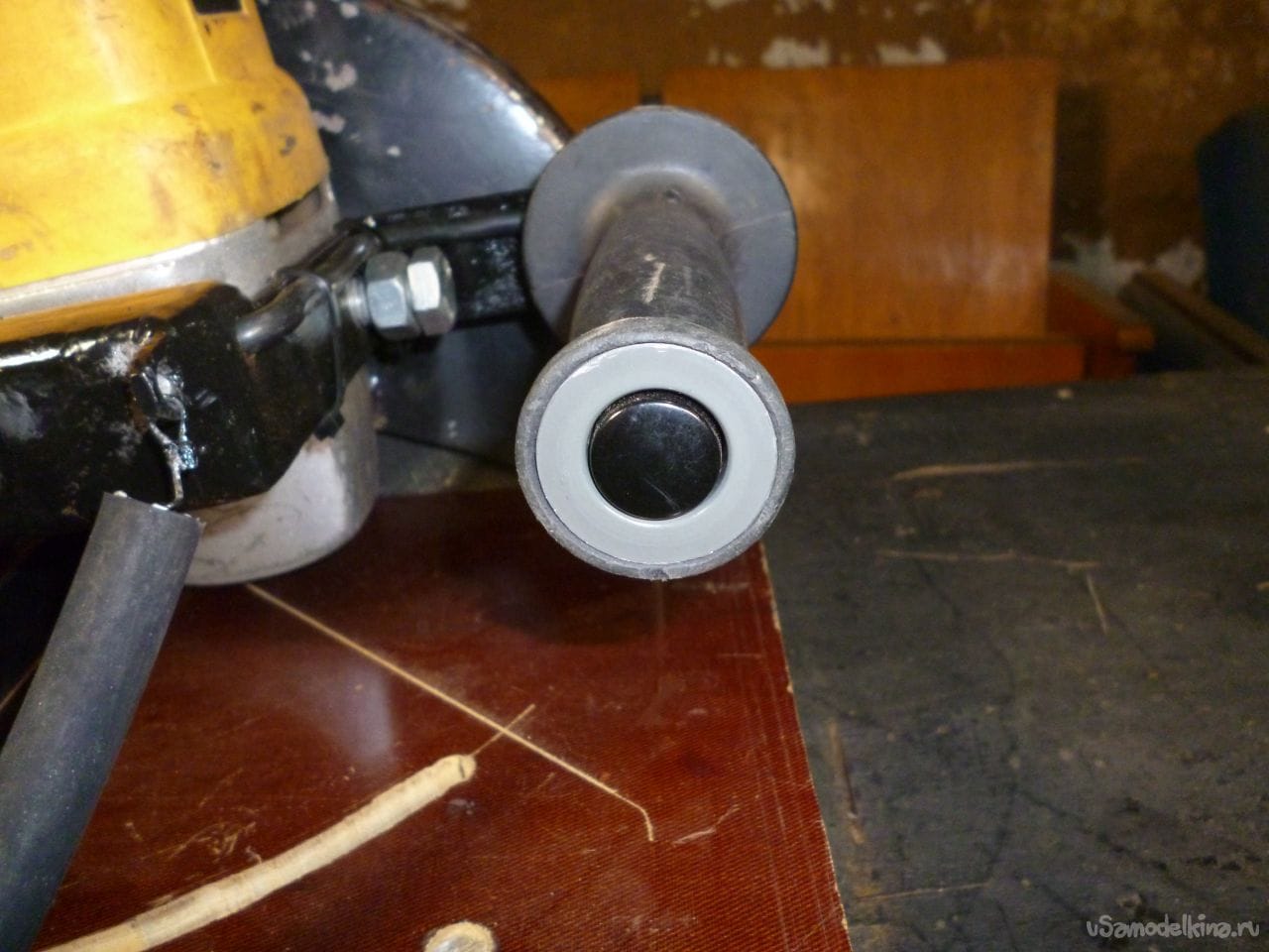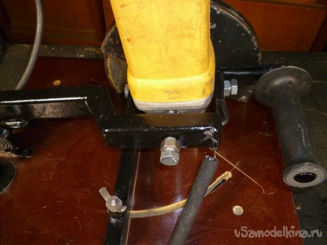 Кнопка пуска на болгарке фиксируется в нажатом положении при помощи пластиковой стяжки. Новая кнопка пуска вставлена в ручку станка. Кнопка не фиксирующаяся, это нужно для повышения безопасности. Электрокабель на кнопку проведен внутри профиля.