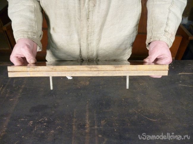 Из сантиметрового текстолита отрезаем два куска и склеиваем их вместе на эпоксидную смолу. Сверлим отверстия и стягиваем текстолит винтами.
