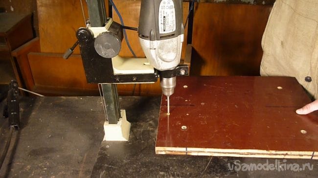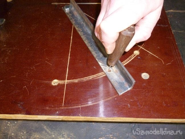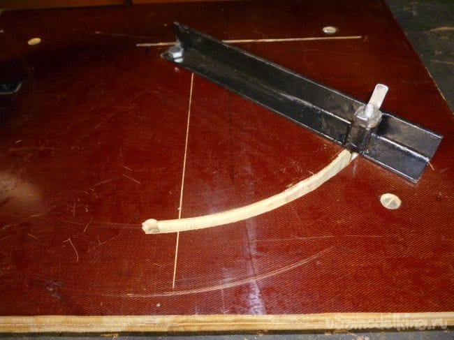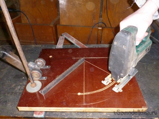 Размечаем на станине дугообразный пропил, просверливаем отверстия и вырезаем электролобзиком.
