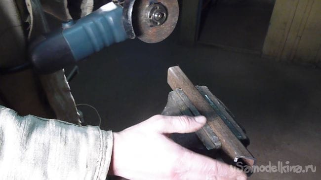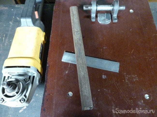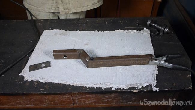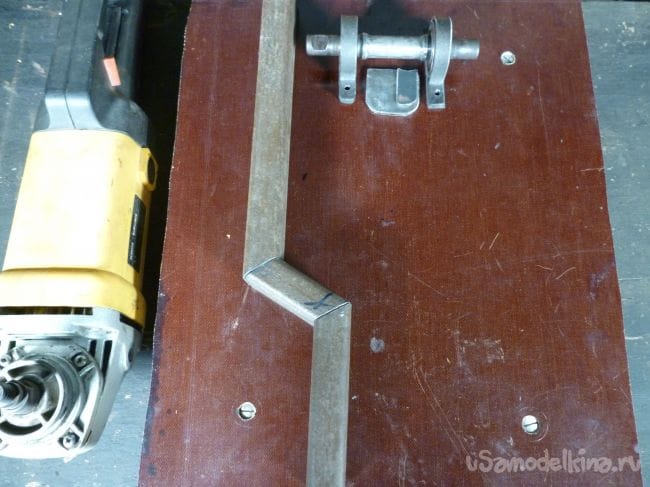 Снимаем размеры с имеющейся в наличии угловой шлифовальной машины и исходя из полученных размеров изготавливаем стойку. Для изготовления используем металлический профиль сорок на двадцать пять миллиметров и полосу шириной три сантиметра.