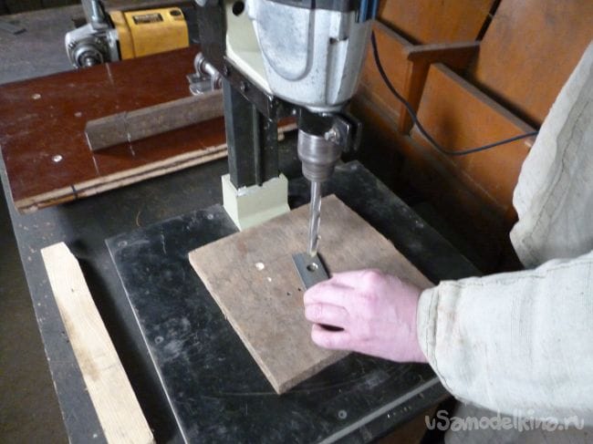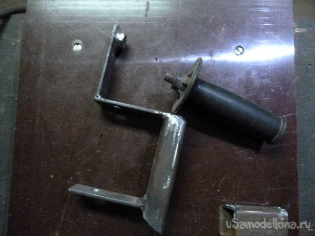 Находим болты, которые вкручиваются в штатные гнезда крепления ручки на болгарке и сверлим под них отверстия в профиле и металлической полосе.