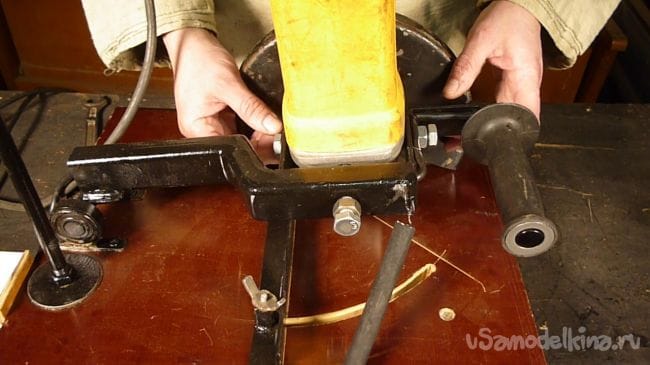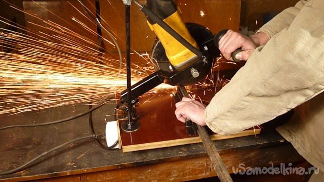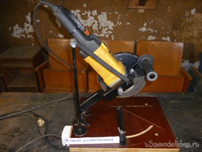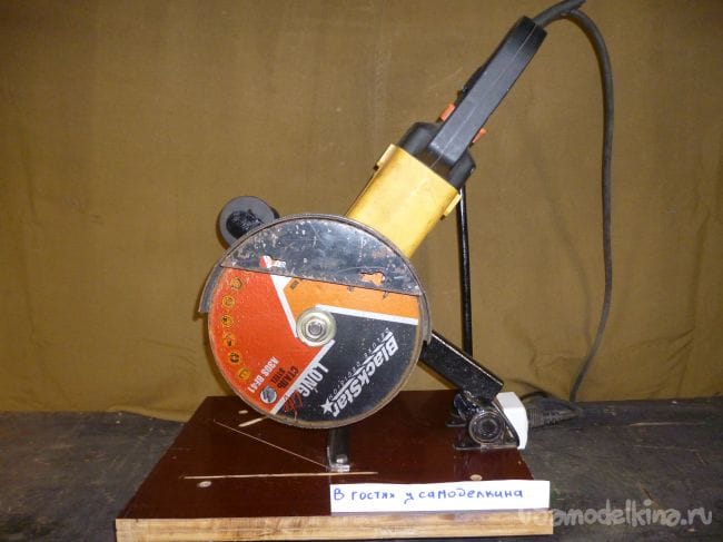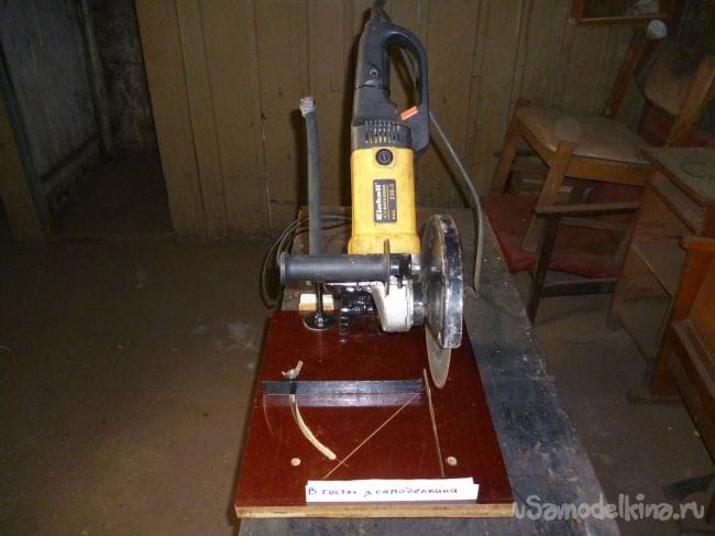 Для этого в станине делаем пропил и вставив в него диск центруем угловую шлифовальную машину.