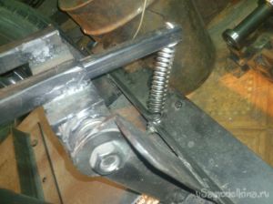 Устанавливаем стойку с пружиной, для более легкого подъема болгарки. Также изготавливаем подвижный упор из уголка.