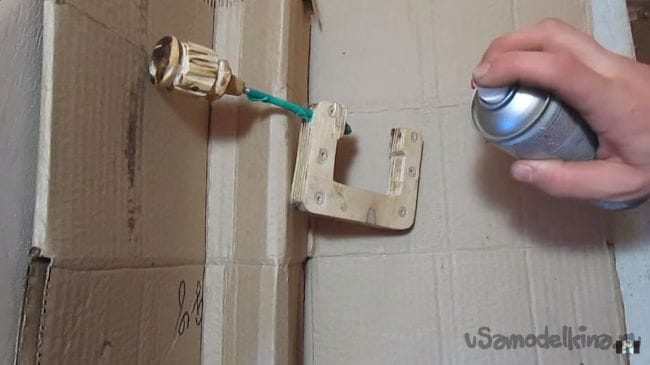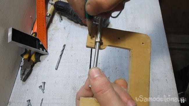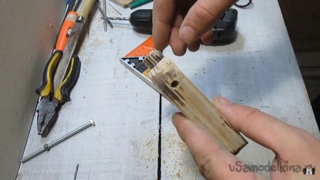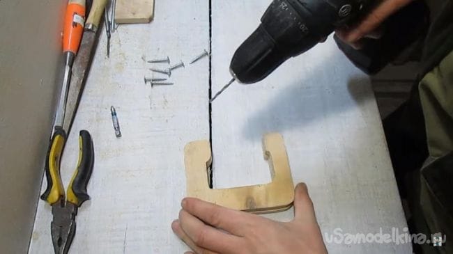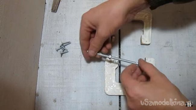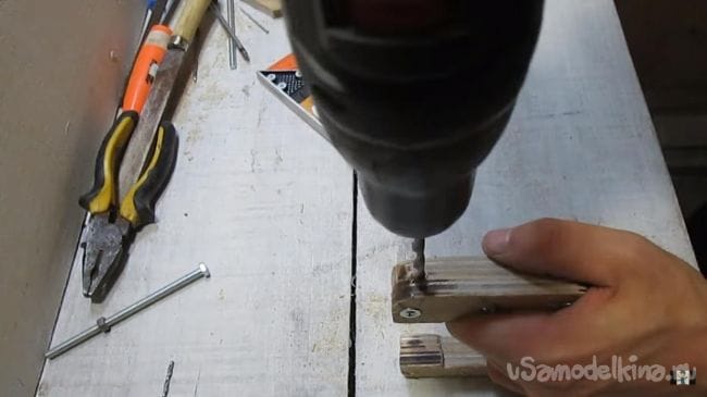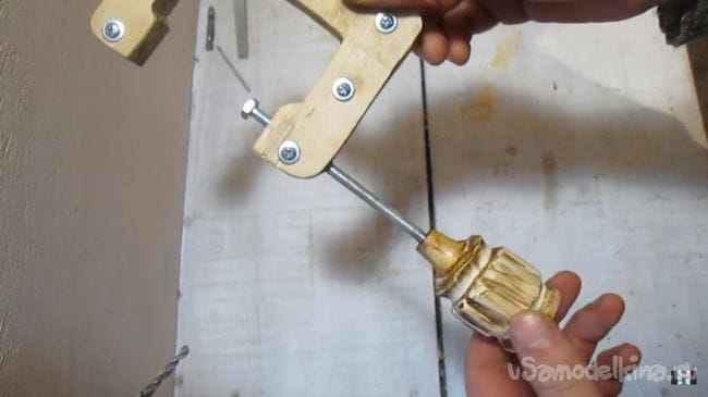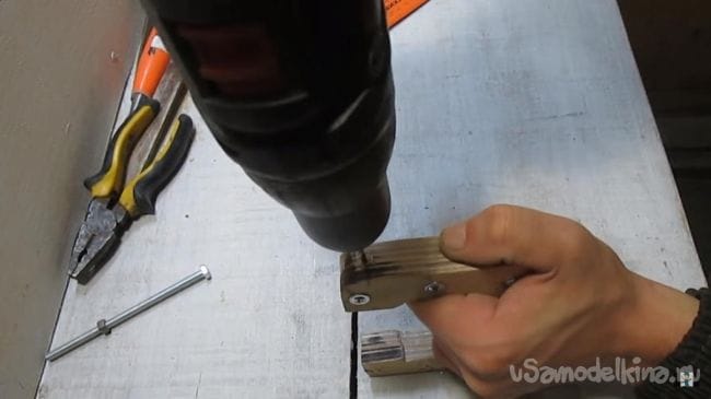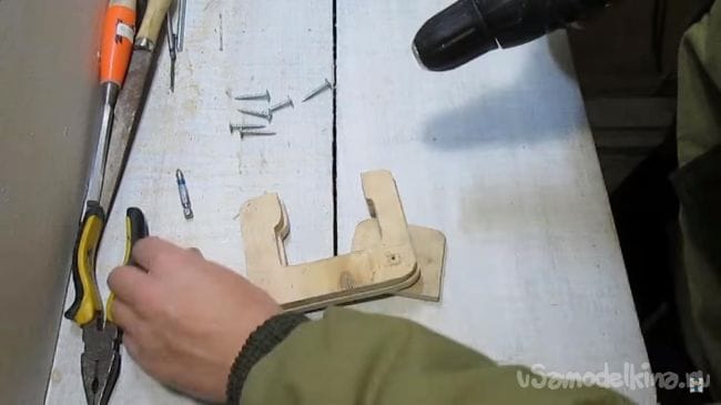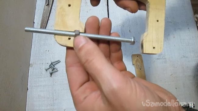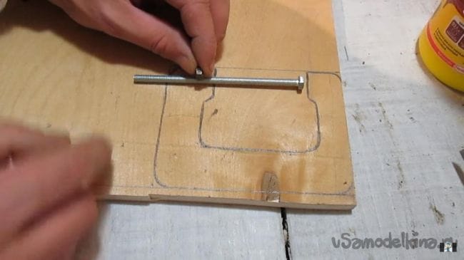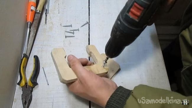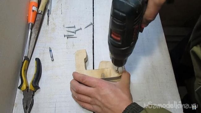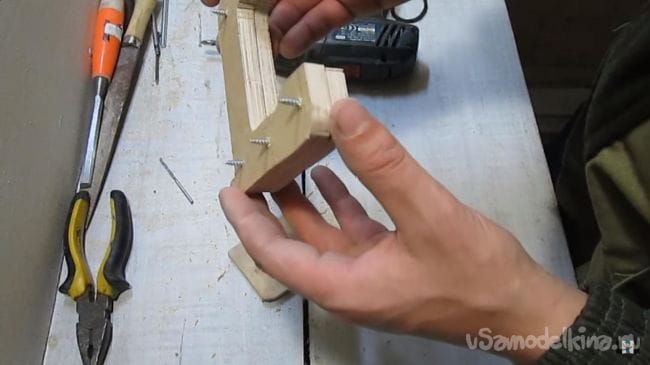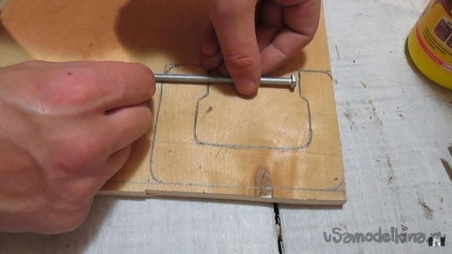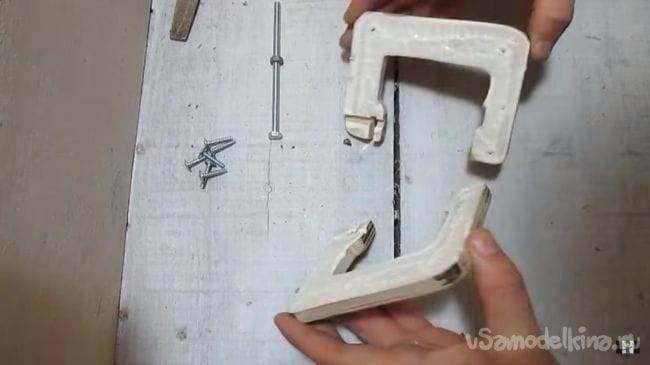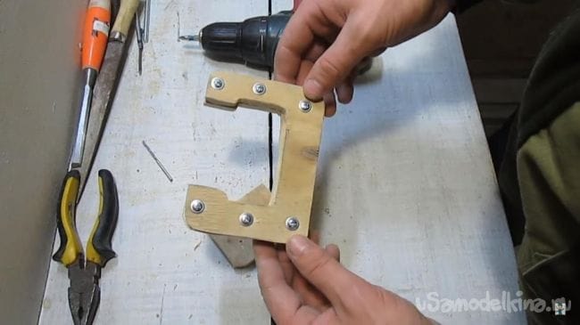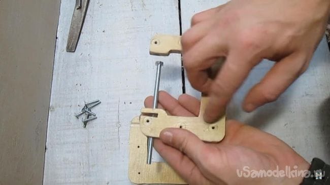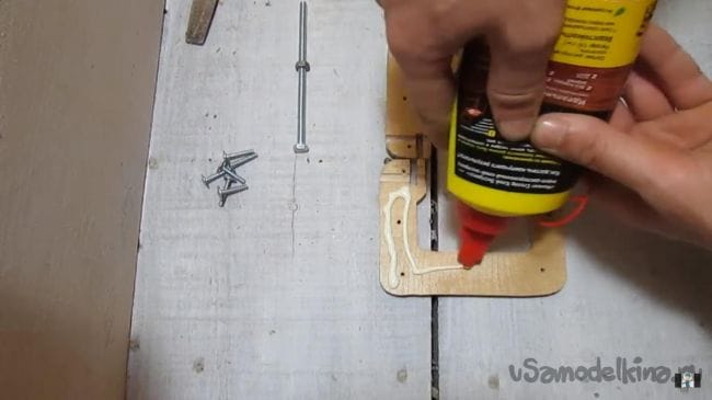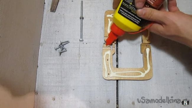 Теперь собираем все детали в единой целое, промазываем клеем ПВА две прилегающие поверхности, равномерно размазываем и ,не забыв установить болт с гайкой, закручиваем саморезы на свои места.