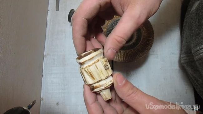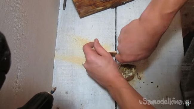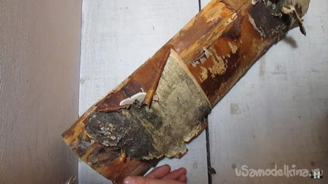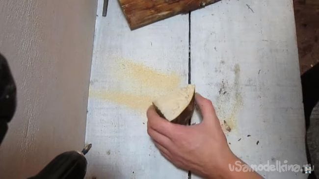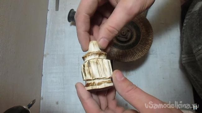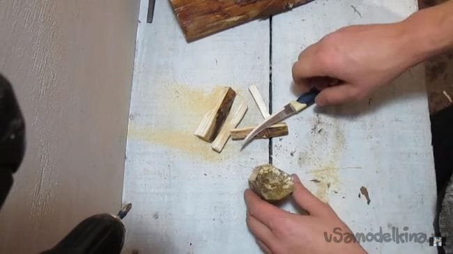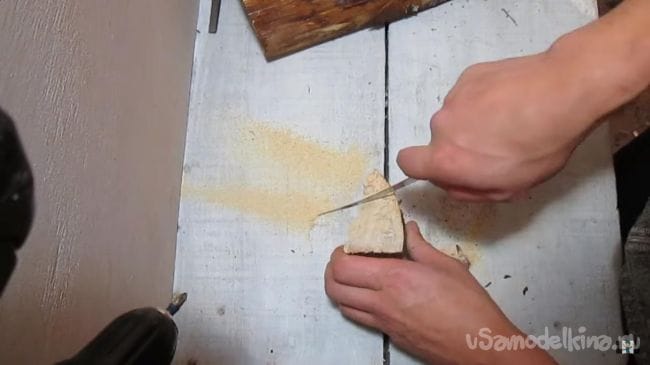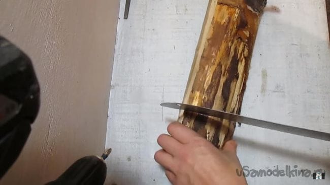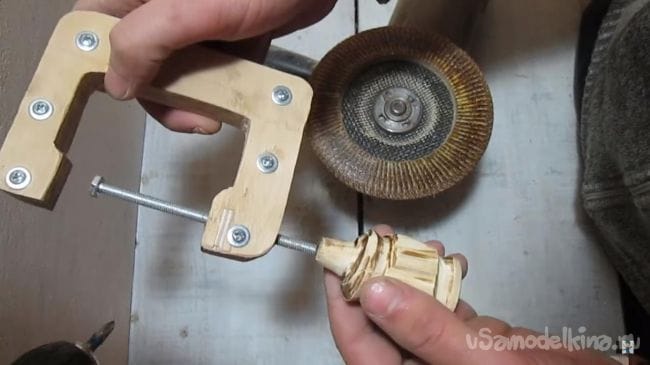Почти все готово, осталось убрать излишки клея, дождаться когда он схватиться, а чтобы попросту не терять время, сделаем ручку для струбцины. Ручку было решено сделать из того, из чего раньше Папа Карло сделал буратино, а именно полено. Отпиливаем нужный кусочек и дальше при помощи острого ножа убираем излишки, придавая деревяшке округлую форму.