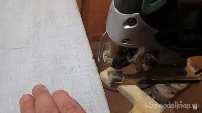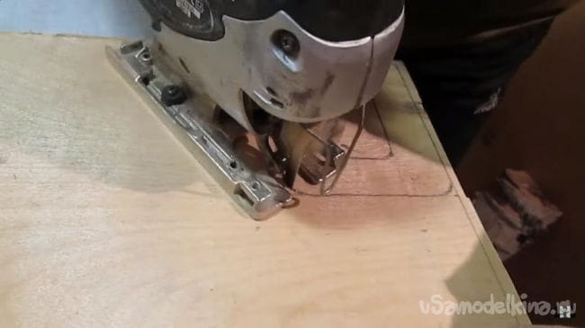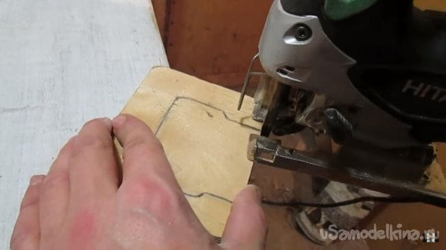 После нанесения эскиза можно выпиливать две одинаковых детали, с этой задачей хорошо справляется электролобзик с пилкой с мелким зубом, что позволяет получать аккуратный рез.