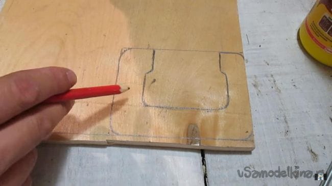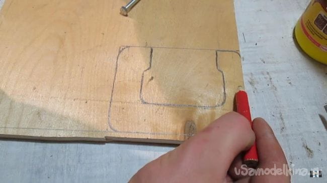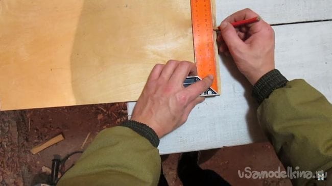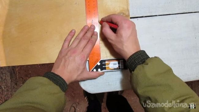 Располагаем фанеру на верстаке и отмечаем размеры будущей струбцины, а точнее ее половины, так как она будет состоять из двух частей, вырезанных из фанеры.
