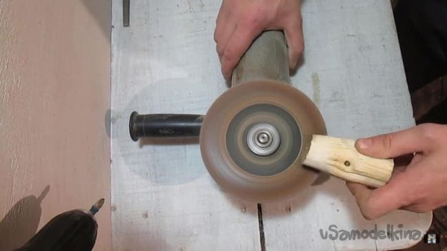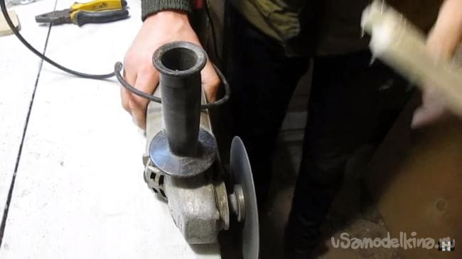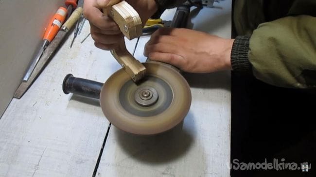 После того, как деталь чуточку стала похожа на рукоять, обрабатываем ее при помощи шлифовального круга, установленного на УШМ. Также делаем насечки для предотвращения проскальзывания в руке в момент затяжки болта.