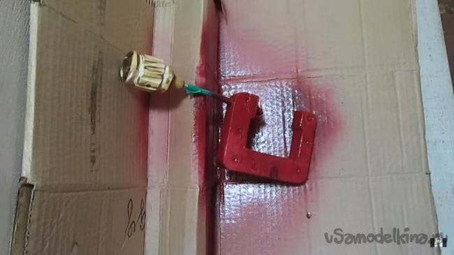 Самоделку можно считать готовой, но вот только со стороны того, что теперь она может выполнять заложенные в нее функции, то есть зажимать детали. Но как же эстетическая составляющая, этим то сейчас и займемся. Осталось в баллончике у меня немного красной краски, обматываем изолентой резьбу болта и красим наше готовое приспособление.