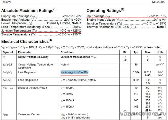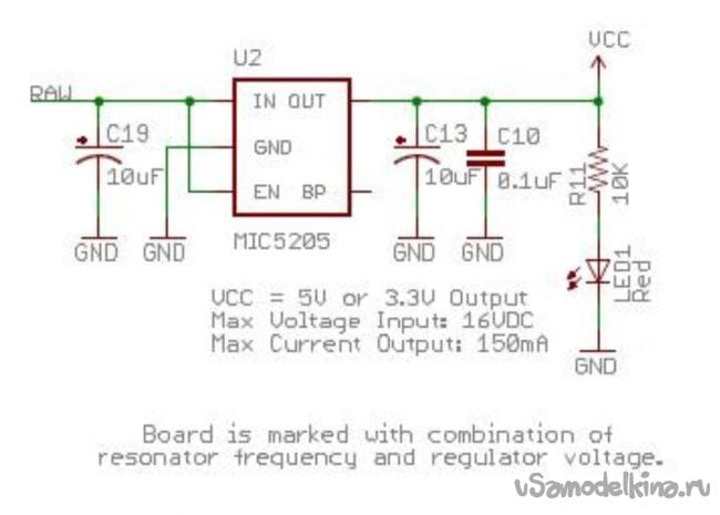 Входное напряжение, подаваемое на микросхему MIC5205, может быть от 2,5 вольт до 16 вольт. При этом на выходе схемы стандартного включения должно быть напряжение около 5 вольт без заявленной точности в 1%. Если воспользоваться сведениями из даташита: VIN = VOUT + 1V to 16V (Vвходное = Vвыходное + 1V to 16V) и приняв Vвыходное за 5 вольт, мы получим то, что напряжение питания платы Arduino Pro Mini, подаваемое на вывод RAW, может быть от 6 вольт до 16 вольт при точности в 1%.