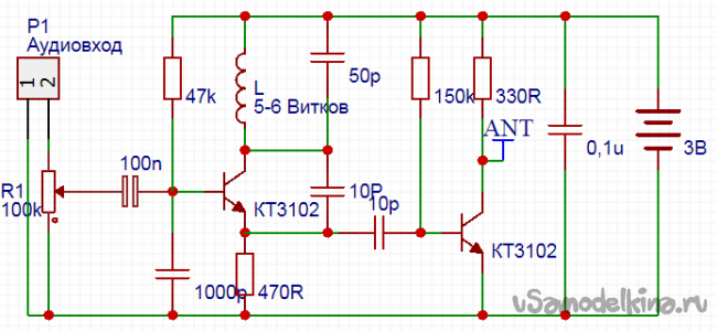 Заработало с первого раза. Попал в самый низ FM диапазона. Поигрался с катушкой, раздвинул ей виточки и настроился на свободную от радиостанций частоту 87МГц. Накрыло все комнаты и кухню. Решили с сыном проверить дальнобойность - метров 50 на улице бьет. Для увеличения радиуса покрытия можно поднять напряжение или поставить более мощный выходной транзистор, но такой цели не было. Да и зачем соседям музыку мою слушать. Так как у меня частный сектор - то при трансляции из дома покрытие практически только моего участочка небольшого. У соседа в доме уже не берет! Идеально получилось.