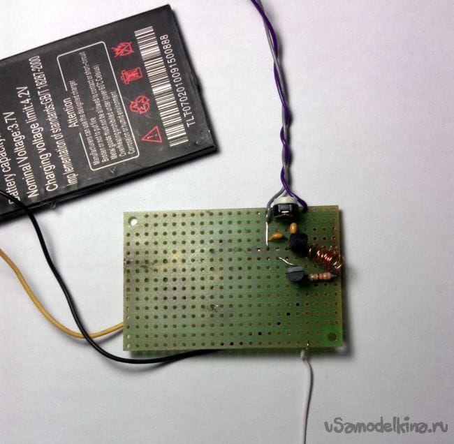 Батарейка - аккумулятор - блок питания - на выбор от 3 до ...12+ вольт (зависит от транзистора). Я поставил АКБ от телефона 3.7В. С повышенным напряжением сегодня не стал играться. Оставлю на следующий раз, будем уменьшать габариты. Травану платку и заколбасим все на SMD.