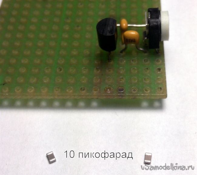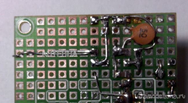 Паяю 50 пикофарад на обратную сторону на тот случай, если не подойдет и придется подбирать из более мелких. Прямо на фото подписал вывод антенны.