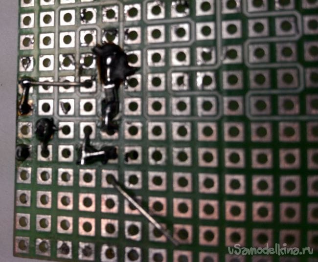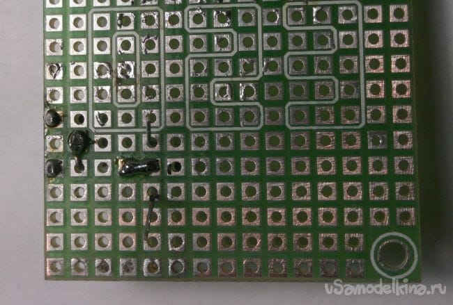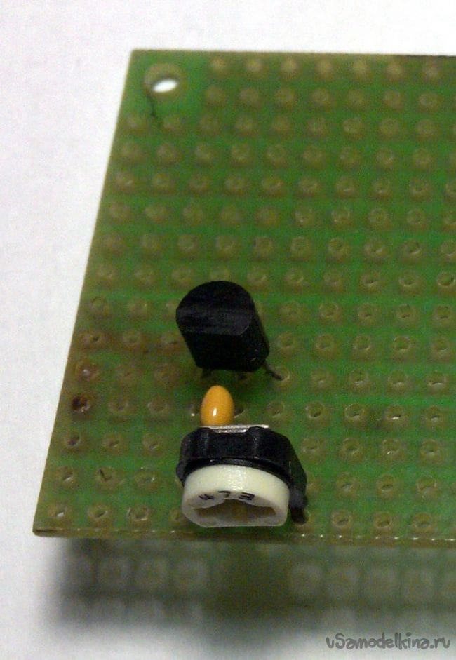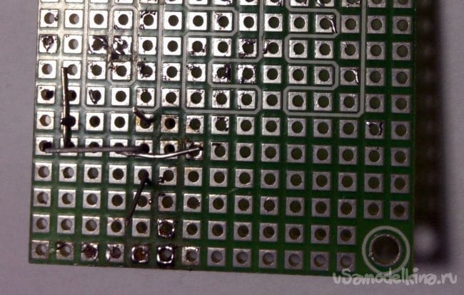 Если пользовать такую монтажную плату, как у меня - ноги на деталях не обрезайте сразу - из них делаются шины плюса и минуса, а также нечто вроде дорожек.