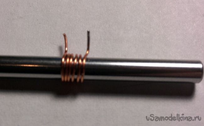 Мотаю на стержень 4мм диаметром, провод 0,3. Лак перед намоткой снял с одной стороны и залудил.