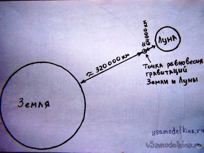 Короче ... между Землей и Луной где-то 384000 км ... на этом отрезке есть такая точка где сила гравитации Земли равна силе гравитации Луны ... так прикинув примерно можно сказать что это расстояние ориентировочно составляет ... 384000/6 = 64000 км от Луны (сила тяжести на Луне в 6 раз меньше Земной, соответственно земное в 6 раз больше) ...