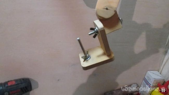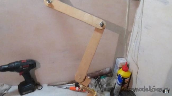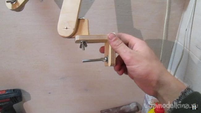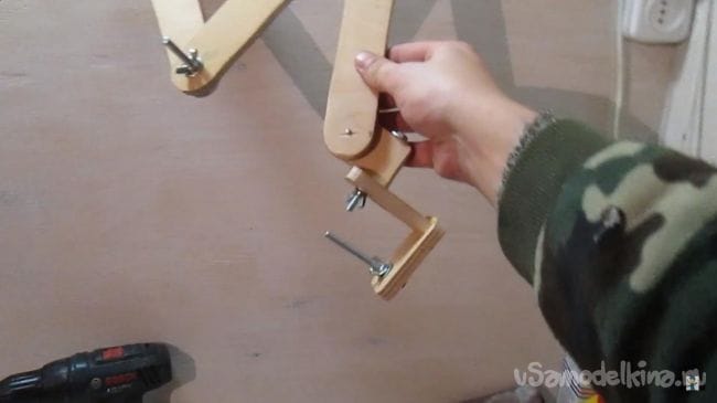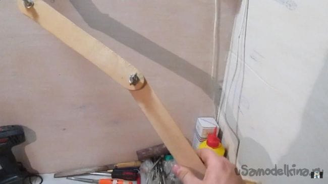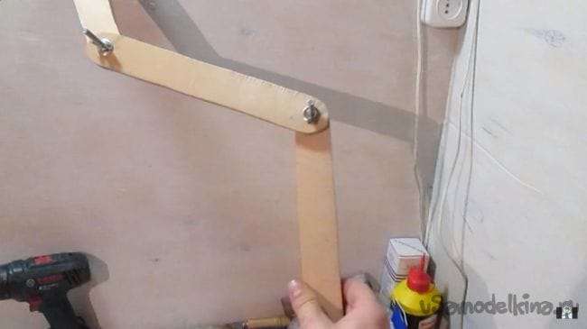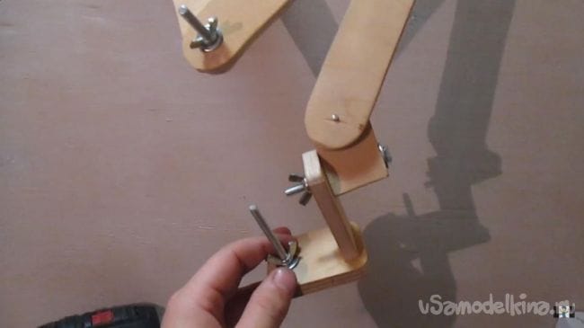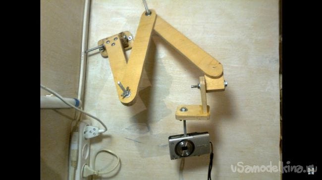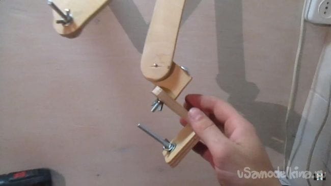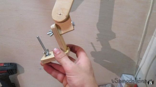 Зашлифованные рычаги из фанеры соединяем вместе при помощи болтов и барашков, перед этим в местах крепления просверливаем отверстие сверлом 6 мм, установленное в электродрель. Данный способ очень удобен, так как ослабив барашковую гайку можно отрегулировать положение рычагов, тем самым поменять ракурс съемки.