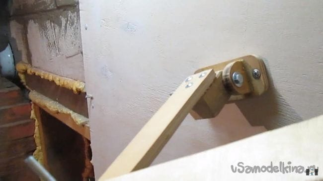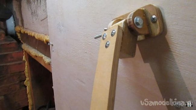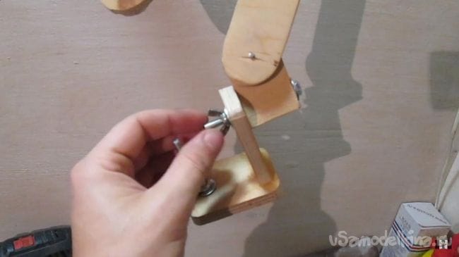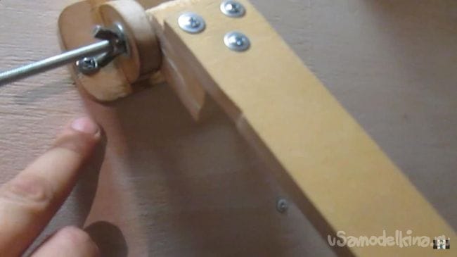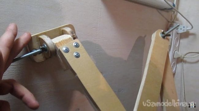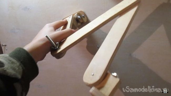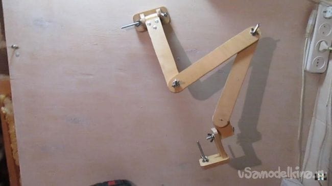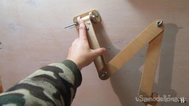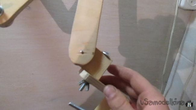 К рычагам также необходимо сделать подошву, которая будет крепиться в моем случае к стене, но при необходимости можно закрепить подошву хоть на потолке, столе или полу. К подошве, изготовленной из той же 8-ми мм фанеры прикручиваем два скругленных отрезка, которые заранее просверлены посередине сверлом 6 мм под болт. Между этими скругленными отрезками устанавливаем деревянный брусок с отверстием 6 мм, в него вставляется болт и зажимается с одной стороны винтом-барашком. Поверх данного бруска прикручиваем один из рычагов на три самореза с пресс-шайбой, остальные рычаги крепятся также при помощи барашковой гайки.