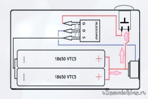 На приведенной выше блок-схеме самодельного бокс мода в принципе все должно быть понятно, самым трудным может оказаться правильно подсоединить мосфет. Если взять транзистор лицом к себе то левый выход соединяем с одним из контактов кнопки, средний выход идет на корпус 510-го коннектора, а правый выход на минусовой контакт аккумуляторов. Резистор припаиваем между левым и правым выходом транзистора.