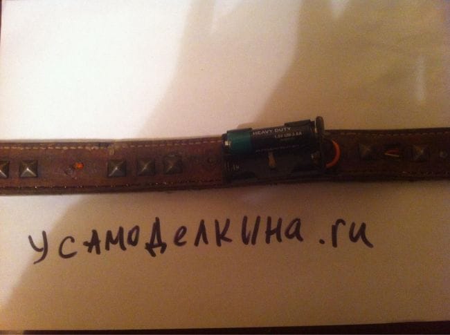 Часть платы с кнопкой, если хотите, можете сразу отломать (у меня кнопка отломалась, буквально на второй прогулке и мне пришлось опять распарывать ошейник), я выключаю, доставая батарейку. Пропускаем провода питания к держателю и подпаиваем. Пришиваем ошейник к подкладке. Чтобы батарейки не выпадали из держателя, сшиваем из широкой одёжной резинки чехол, протягиваем через ошейник и одеваем на держатель. Всё ошейник готов.