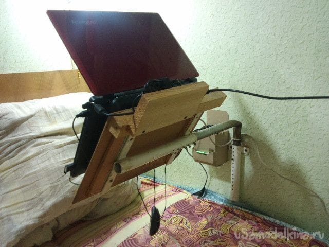 4. Приспособление крепится к стене, оно универсально и легко настраивается. При ненужности ноутбук мжно снять, а конструкцию завернуть к стене.