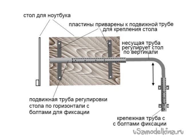 2. Сделал подставку (стол)по размеру своего ноутбука и закрепил её на длинном конце трубы. Стол крепится тоже на трубе диаметром как и короткий кронштейн. Подставка легко передвигается по длиной трубе, тем самым есть возможность регулировать "под себя" по горизонтали.