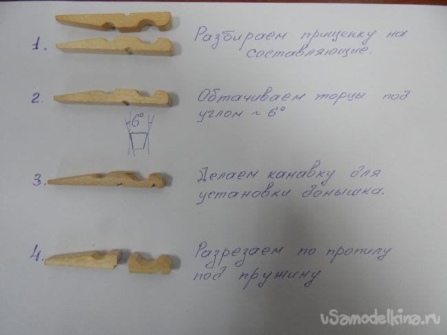 2. Прищепки разбираем на составляющие. Нам понадобятся только деревянные части. Торцы подтачиваем на крупной наждачке до вида трапеции с углами у основания около 6-ти градусов для того, чтобы не было щелей после приклеивания. Далее делаем канавку для донышка на той стороне, которая будет приклеиваться к банке. Разрезаем прищепку по выточке для пружины, лучше конечно по дополнительной разметке, чтобы потом меньше обтачивать по окончании. И разрезать советую непосредственно перед приклеиванием, чтобы верхняя часть по ширине, цвету и рисунку совпадали.
