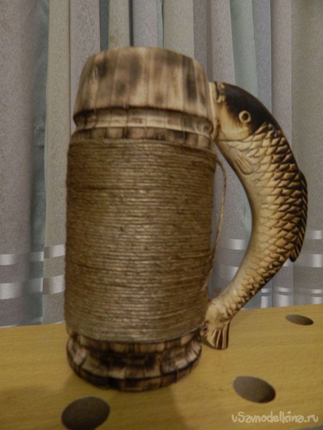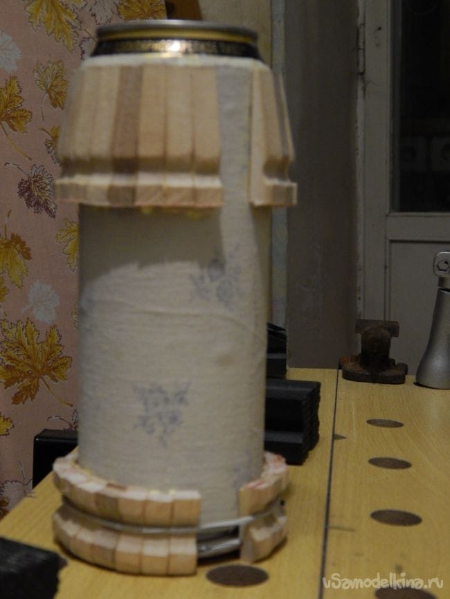 8. Приступим к заполнению пространства между верхними и нижними частями приклеенных прищепок. Как я уже писал, всё зависит от фантазии- можно заполнить речным песком, пропитанным клеем, можно оклеить камешками, ракушками, бижутерией, монетами, скорлупой орехов ну и так далее, у меня это будет джутовый шпагат- он и по цвету подходит, и смотрится не очень плохо. Чтобы не мотать всю бобину и сэкономить шпагат просто заполнил лишнее пространство макулатурой приклеив несколько слоёв до оставшейся толщины шпагата, и уже потом приклеил шпагат, намотав его виток к витку. Кстати теперь можно отрезать верхушку банки, из-за наклеенных прищепок жесткость намного увеличилась, и больше нет опасности деформировать края кружки.
