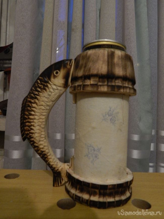 9. И наконец последний штрих- украшательство. В начале совсем не хотел что-либо лепить, но так кружка выглядела слишком скромно- не тянула на подарочный сувенир. Поэтому выбрал я простенький рисунок скелета опять же рыбы, вырезал его из белого шпона и наклеил на фасад кружки. С размером конечно переборщил, но думаю тот, кому подарю, будет не в претензиях (в крайнем случае оторвёт рисунок).