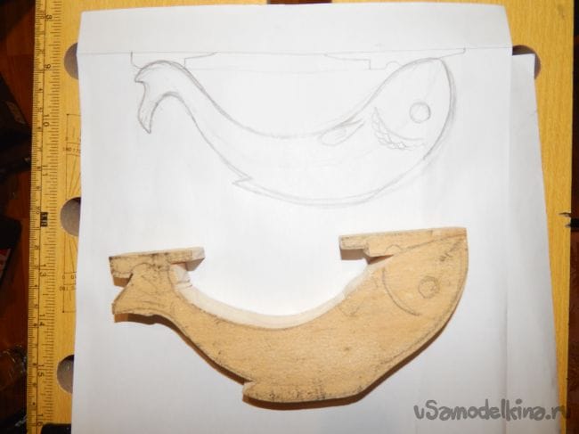 Далее рисуем эскиз, вписывая габариты ручки в размер профиля, переводим его на доску, выпиливаем, обстругиваем, обтачиваем и вырезаем глаза, жабры, плавники и чешую (резьбу по дереву описывать не имеет смысла).