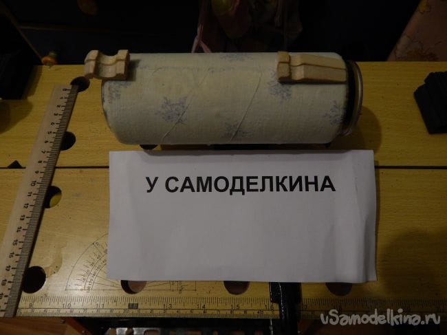 5. Теперь приступаем к изготовлению ручки. У меня она будет в форме рыбы. На листе бумаги проводим линию, на которой намечаем отрезок, равный высоте кружки (от нижнего до верхнего концов приклеенных половинок прищепок). Прикладываем прищепку и обводим контур, чтобы получить профиль разреза кружки.
