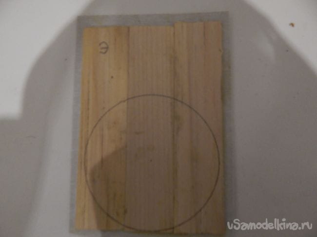 3. Из деревянных линеек делаем донышко кружки. Наклеиваем отрезки 7см на бумагу в стык, чертим окружность 67мм, лобзиком вырезаем донышко и ножом снимаем фаску .