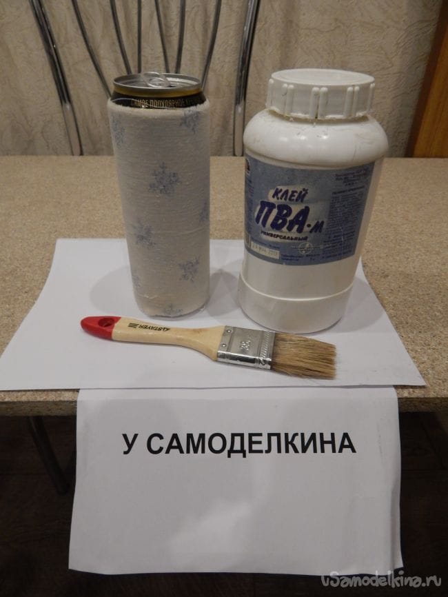 1. Для начала оборачиваем банку в два слоя тканью, пропитанной клеем ПВА.